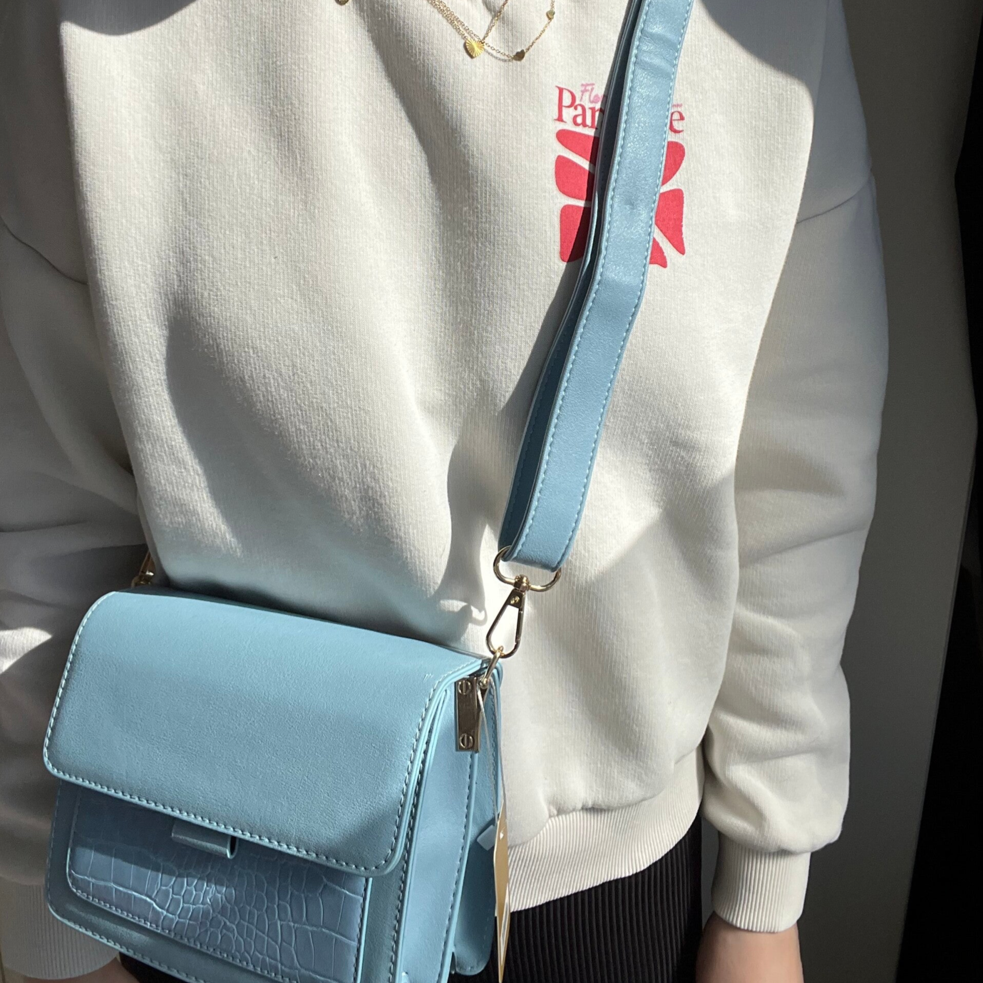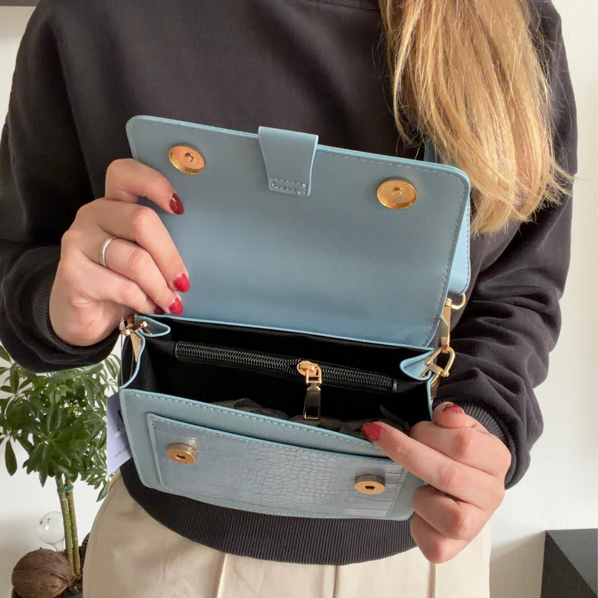 Aan de binnenkant vind je drie vakken: twee open vakken voor snelle toegang tot je essentials en een vak met ritssluiting voor waardevolle items. Daarnaast heeft de tas een handig voorvakje met crocoprint, ideaal voor kleinere spullen die je snel bij de hand wilt hebben. Inclusief een leuke bijpassende bagstrap, zodat je deze tas comfortabel en met extra flair kunt dragen.